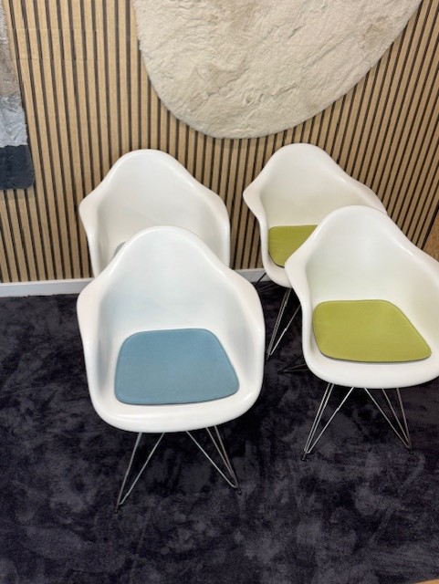 Een vintage-look kuipstoel in witte uitvoering. Onderstel verchroomd. Stoelen in stijl van de klassieke Eames-kuipstoel.